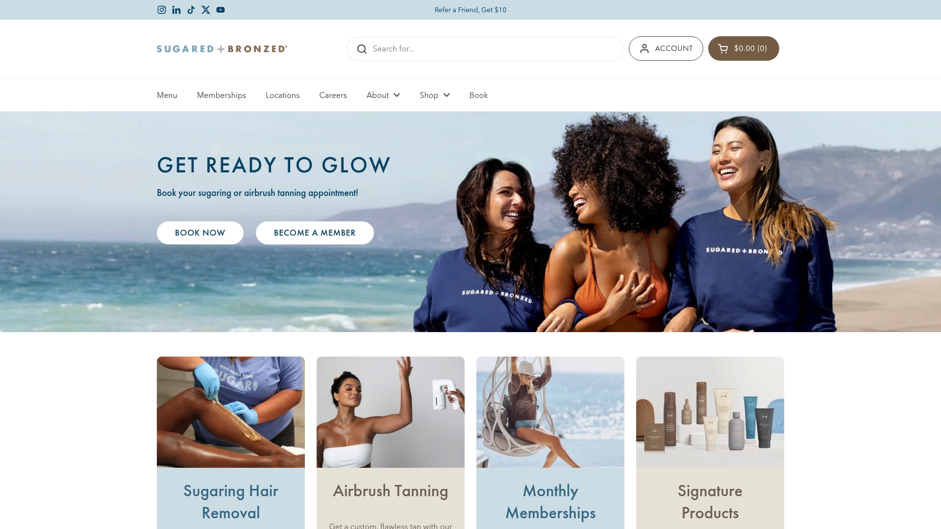 Sugared + Bronzed pairs natural sugaring hair removal with custom airbrush tanning to deliver polished, event-ready results for urban clients. Their fast-acting, long-lasting spray tans use a flexexpress™ formula, and a robust signature product line helps you maintain that glow between appointments. Memberships offer genuine savings and rollover benefits, which is a smart fit if you plan regular visits. On the downside, service pricing, appointment durations, and ingredient transparency are not clearly listed on the site.